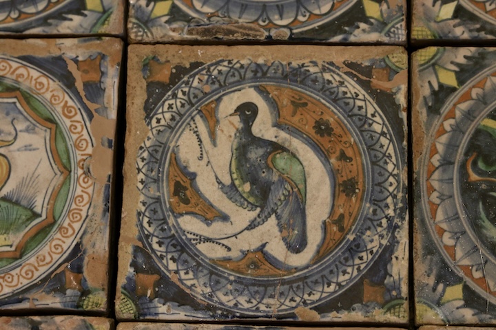 Bird tiles part of the floor in ceramics at the Lando Chapel in the church of San Sebastiano, Venice, 1531-1542