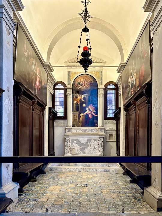 The chapel is dedicated to the Assumption of the Virgin Mary. It lies to the left of the main altar next to Paolo Veronese’s tomb. It was acquired by the family of Marco Lando in 1531, the grandson of Girolamo, patriarch of Constantinople. The family chapel, where more members of the family were buried, was handed to the Vitturi family in 1542. This seems to prove the 384 maiolica tiles were laid here in those years. But this is all we know about them.