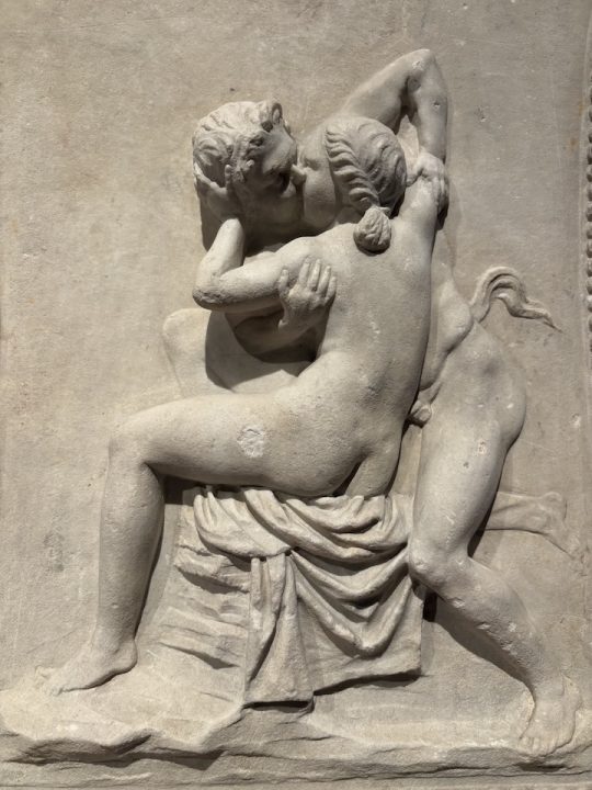 One of the sides of the ara shows a kiss between a satyr and a maenad in the world of Dionysius feasts.