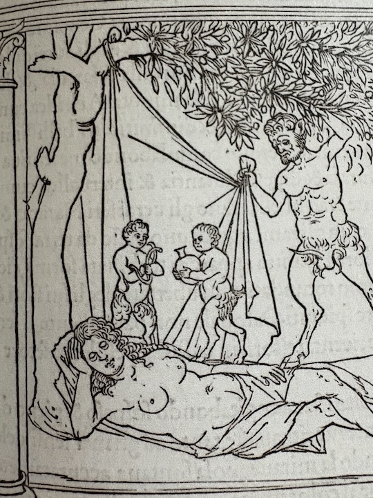 Sleeping nymph unveiled by a satyr from Francesco Colonna, Hypnerotomachia Poliphili, Venice, published by Aldus Manutius in 1499, Giorgio Cini Foundation; detail.