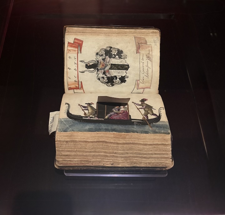 In the cover of this post you can see a love scene in a gondola with a flap you lift, Liber Amicorum by Hans Christoph von Puchheim, 1591-1601, Camillo Caetani Foundation, Rome