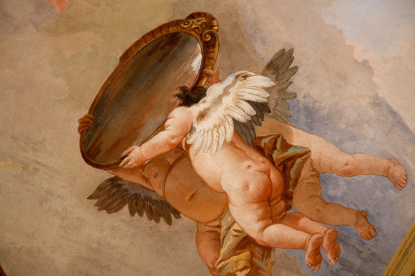 In 1369, eventually, a real production of mirrors in glass started on the famous Venetian island. Here is the arrival of the mirror brought by cherubs in a fresco by Giambattista Tiepolo in Ca’ Rezzonico palace.
