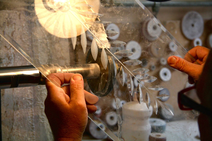 The design and the composition, the engraving of the various motifs with the stone wheel, the preparation of every single piece and finally the pouring over the pane of the silver nitrate and the shining mirror appearing. And the collaboration with the interior designer and architect Philippe Starck or with the American artist Jeff Koons or the prestigious hotels all over the world and luxurious private homes in the Middle East or in Russia.