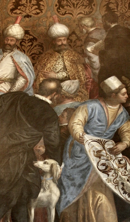 Gabriele Caliari, Persian Ambassadors meeting Doge Marino Grimani in 1603, Doge’s Palace, Hall of the Four Doors, early 17th century. Detail of the fabrics donated by Persians